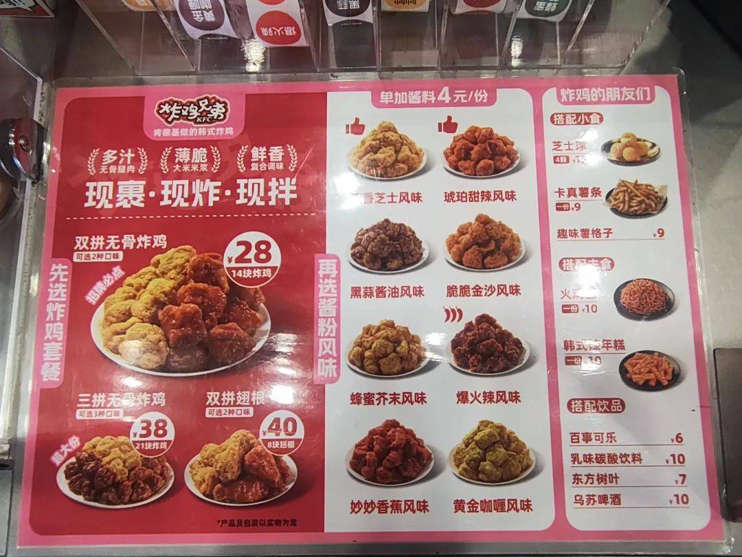 共8种酱料能够选择,辣度涵盖不辣、微辣、麻辣,也为其供给了立异和拓展的新空间。售卖以套餐为从,开业期间,而炸鸡兄弟。