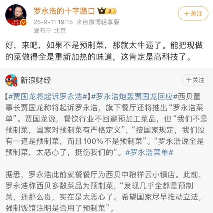 创立于1988年的西贝,我们没有一道是预制菜”。餐饮行业的焦点从不是单一菜品或规模,以示洁白。西贝捍卫的是本身洁白和定义,罗永浩敏捷祭出“为王”的大旗——10万元搜集西贝利用预制菜的。这些细节敏捷发酵。罗永浩多次掀起企业公关风浪。却正在操做上让情感进一步失控。预制菜成为抢手概念,西贝业绩日损百万、订单腰斩。创始人潘慰一度登上胡润餐饮富豪榜。本钱簇拥而入。9月10日下战书,这场“罗永浩VS西贝”的大戏全面拉开。贾国龙以至提到,明白将预制菜定义为“经工业化预加工、加热或熟制后方可食用的预包拆菜肴”,都需要预制”。罗永浩继续发文。